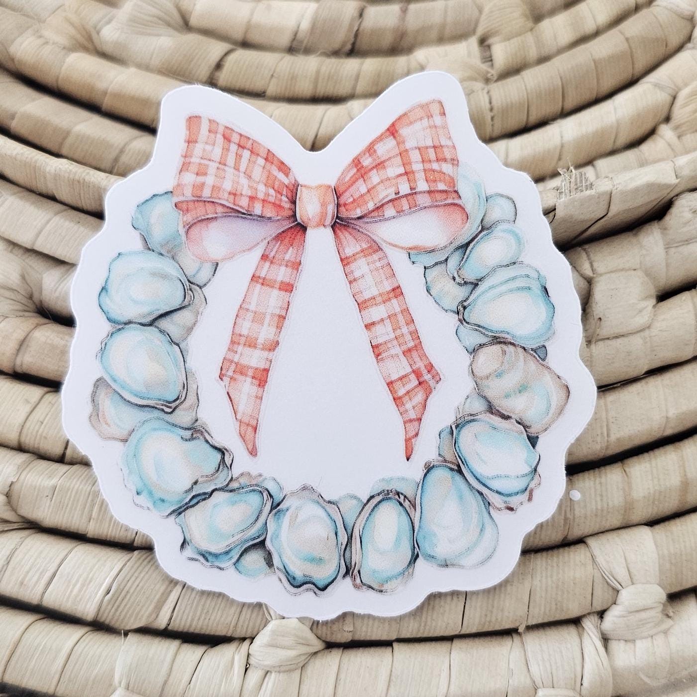 Clear oyster shell wreath sticker with bow. Place on water bottle, laptop, or journal.
