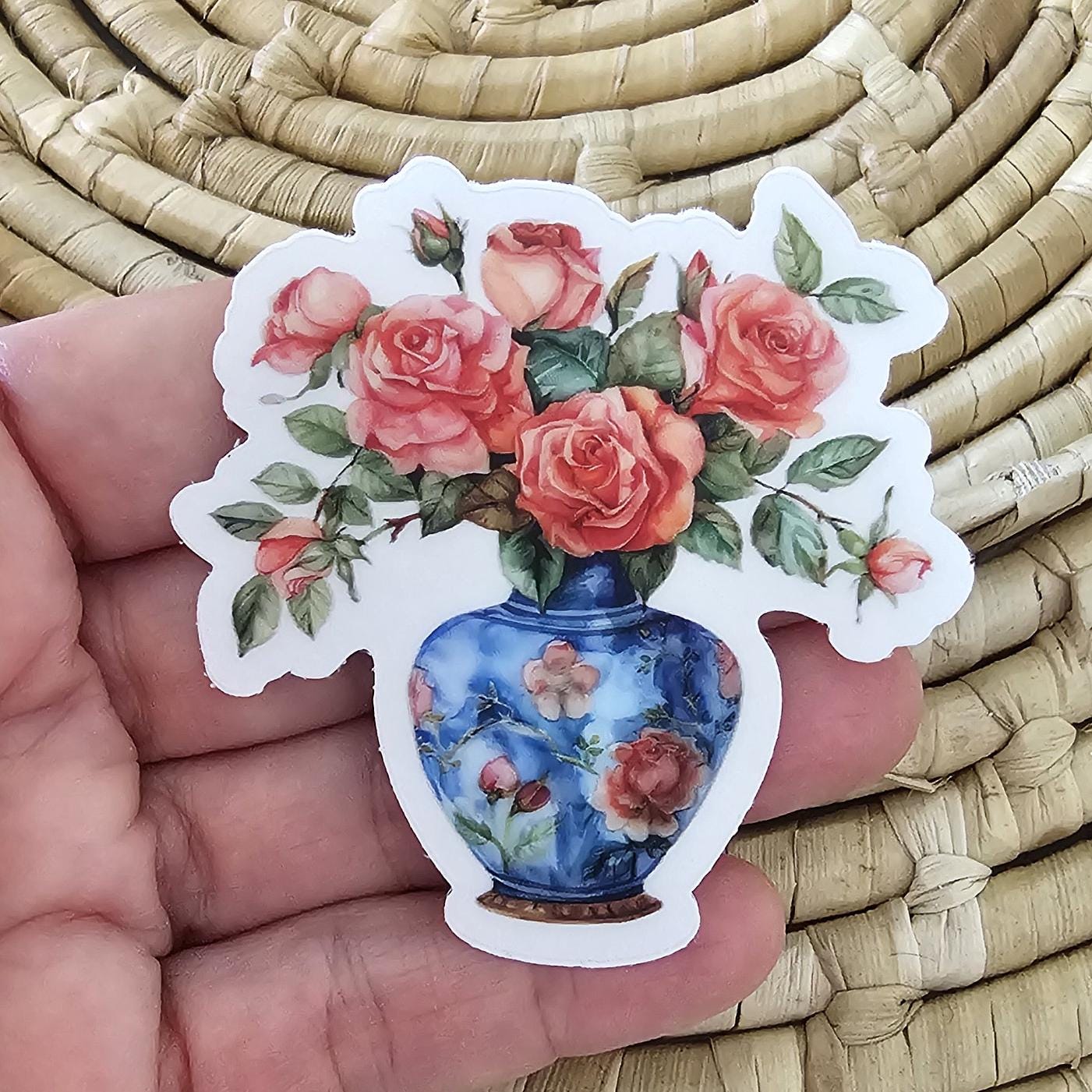 Chinoiserie vase sticker with flowers printed on clear vinyl sticker paper. Place this sticker on your water bottle, coffee mug, laptop, car or anywhere you want a little decoration.