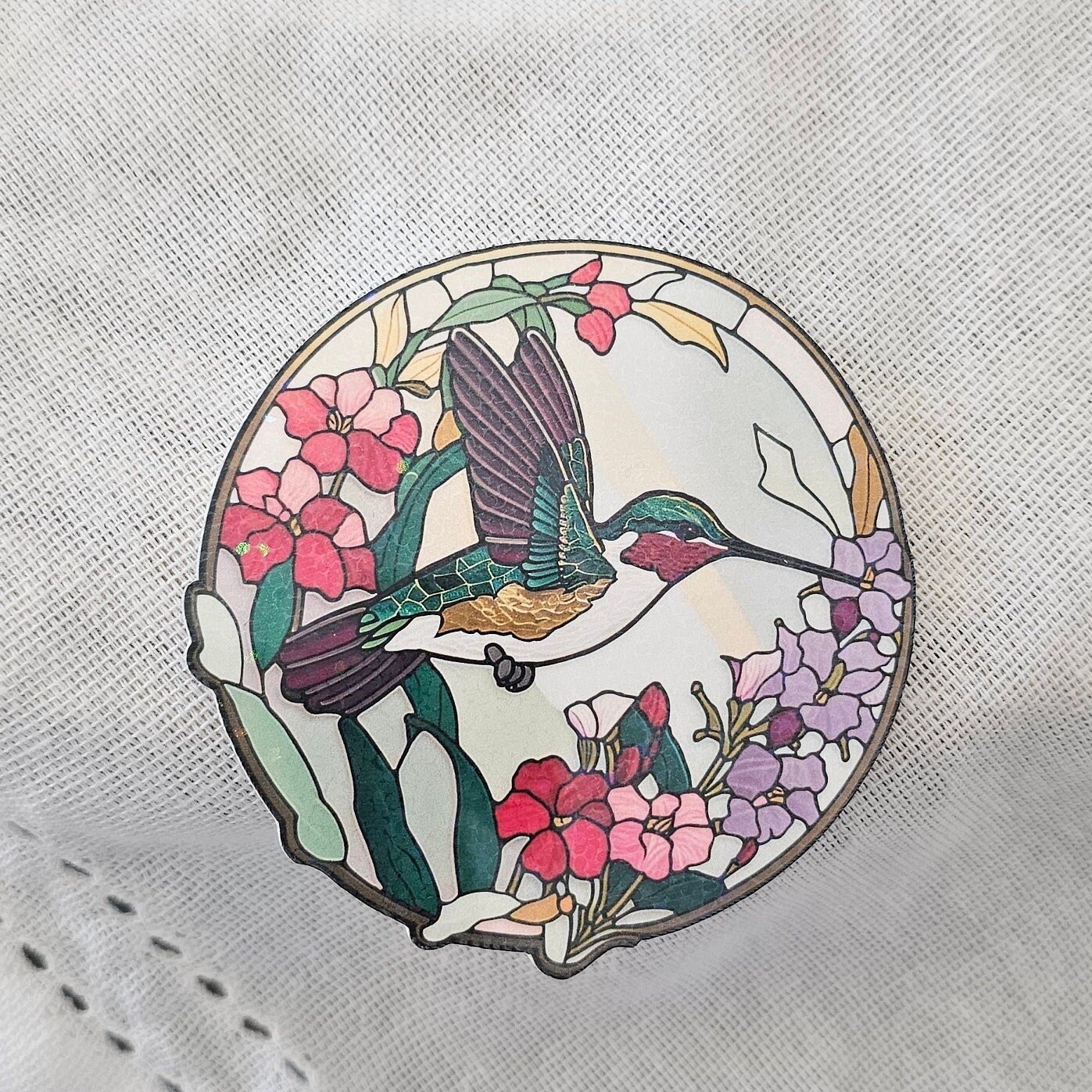 Holographic stained glass hummingbird sticker. Perfect for your laptop, water bottle, or journal.